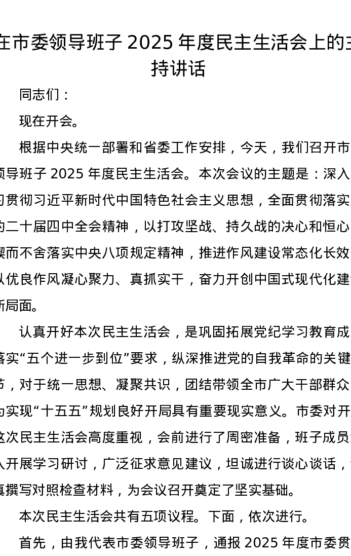 在市委领导班子2025年度xxxxx上的主持讲话