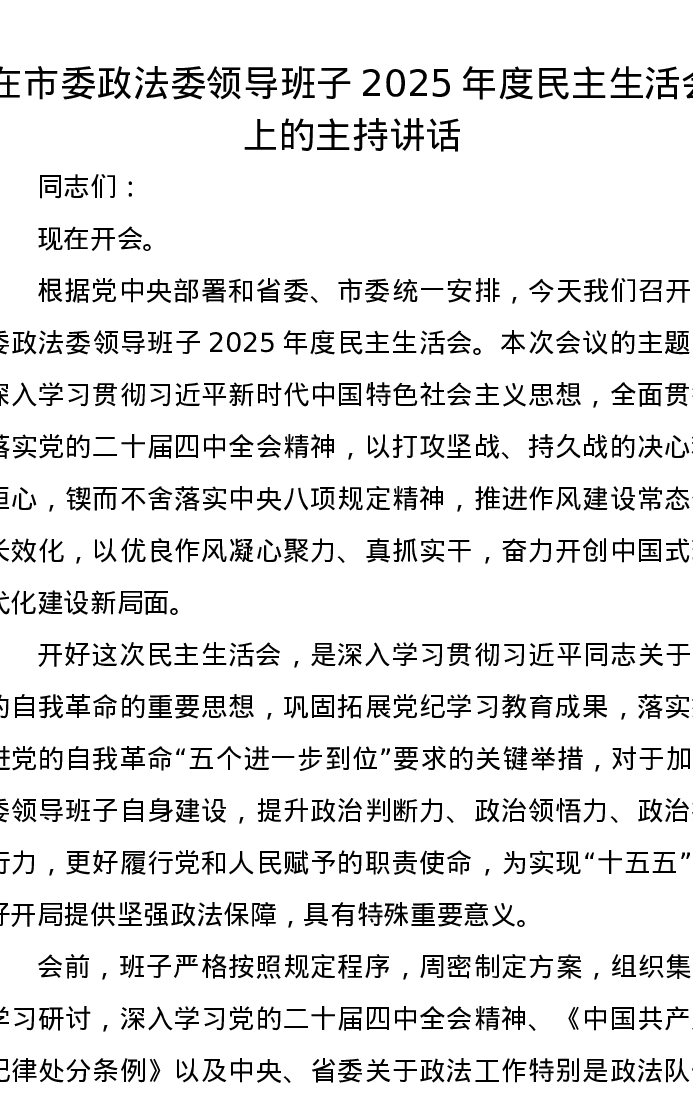 在市委政法委领导班子2025年度xxxxx上的主持讲话