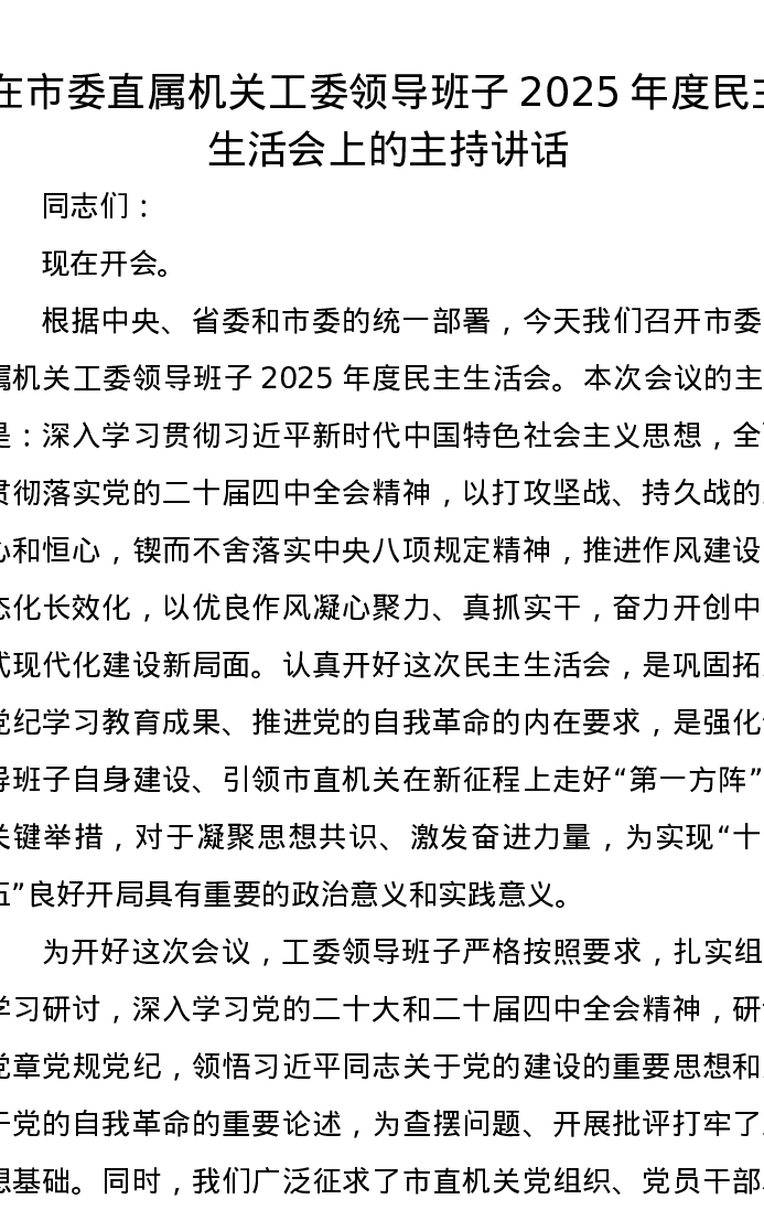 在市委直属机关工委领导班子2025年度xxxxx上的主持讲话