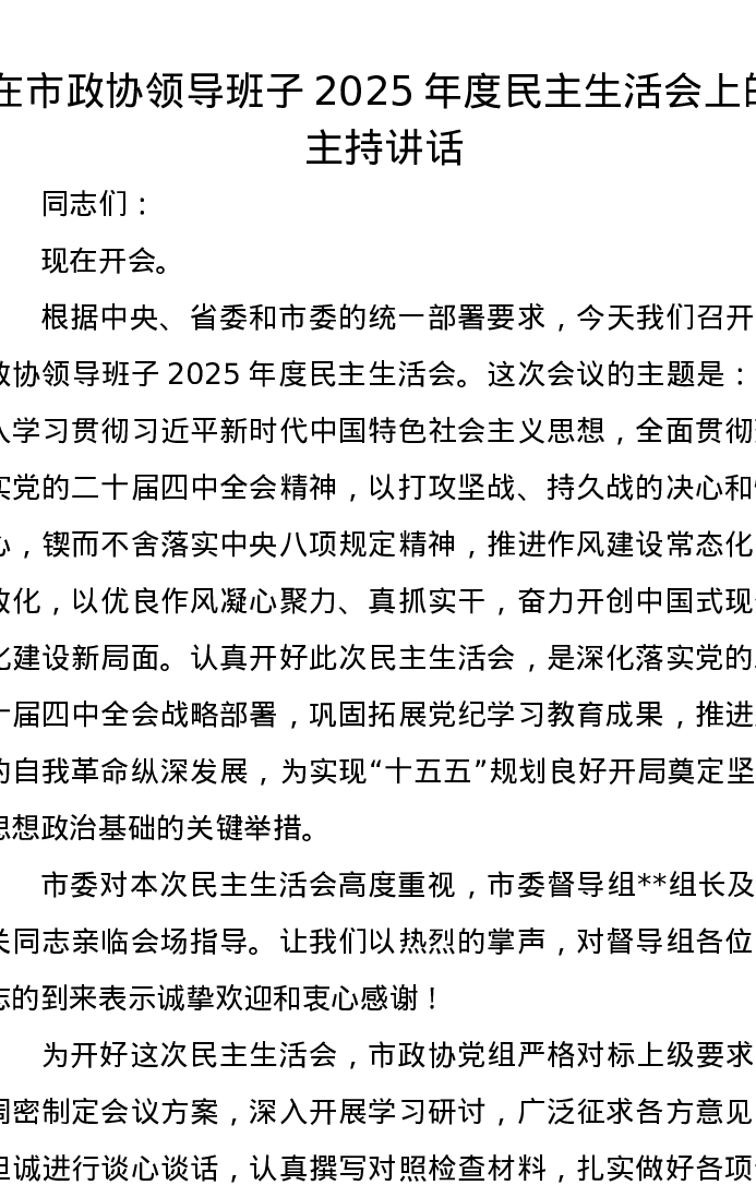 在市政协领导班子2025年度xxxxx上的主持讲话