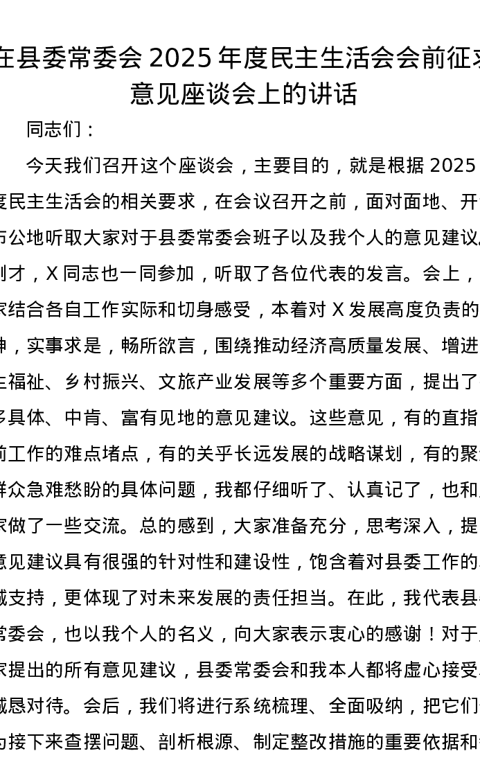 在县委常委会2025年度xxxxx会前征求意见座谈会上的讲话