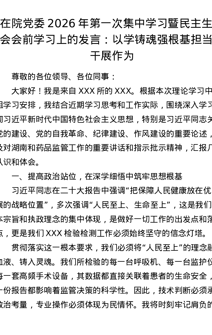 在院党委2026年第一次集中学习暨xxxxx会前学习上的发言:以学铸魂强根基担当实干展作为