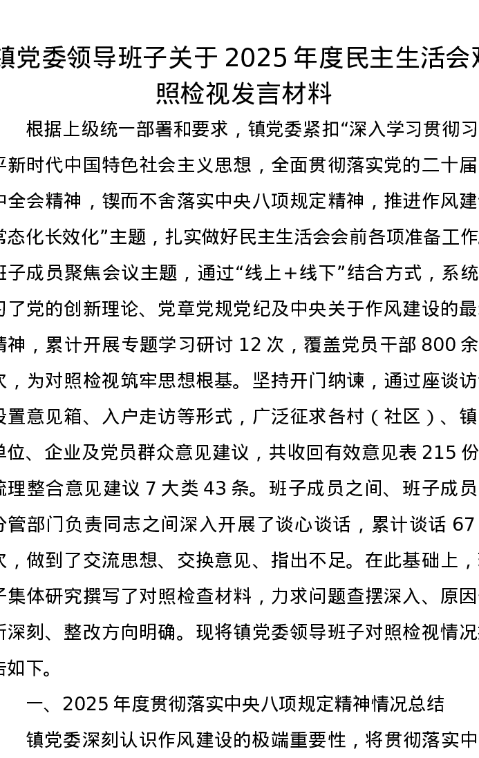 镇党委领导班子关于2025年度xxxxx对照检视发言材料