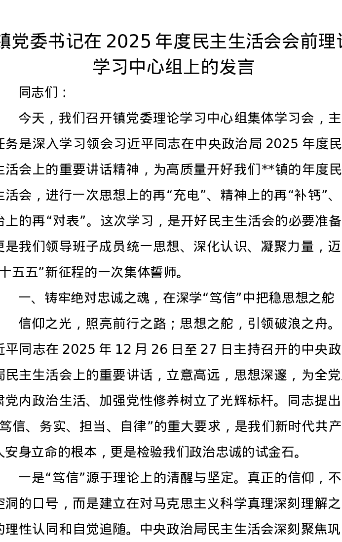 镇党委书记在2025年度xxxxx会前理论学习中心组上的发言