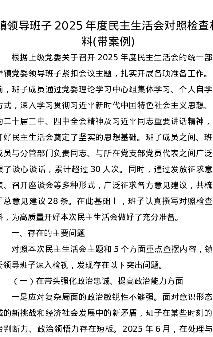 镇领导班子2025年度xxxxx对照检查材料(带案例)
