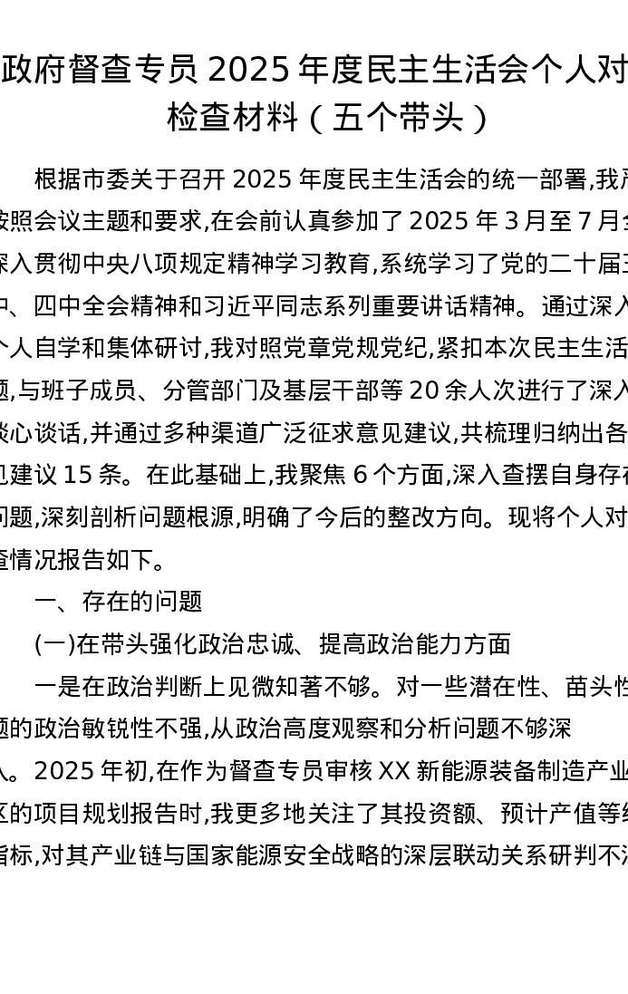政府督查专员2025年度xxxxx个人对照检查材料(五个带头)