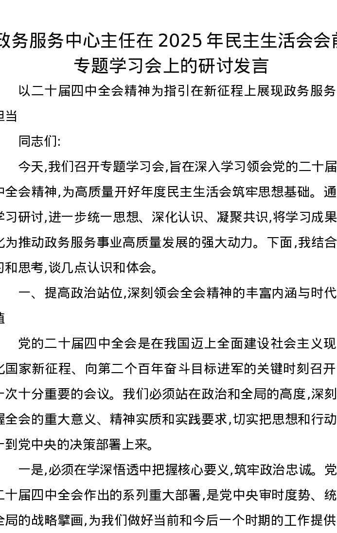 政务服务中心主任在2025年xxxxx会前专题学习会上的研讨发言