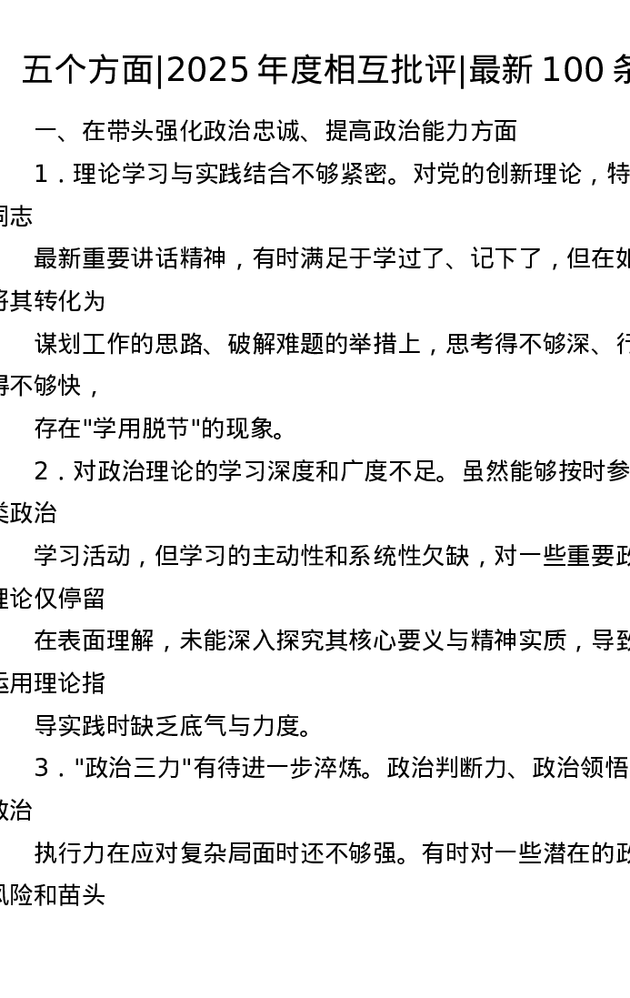 最新-2025年度xxxxx班子成员相互批评意见清单100条