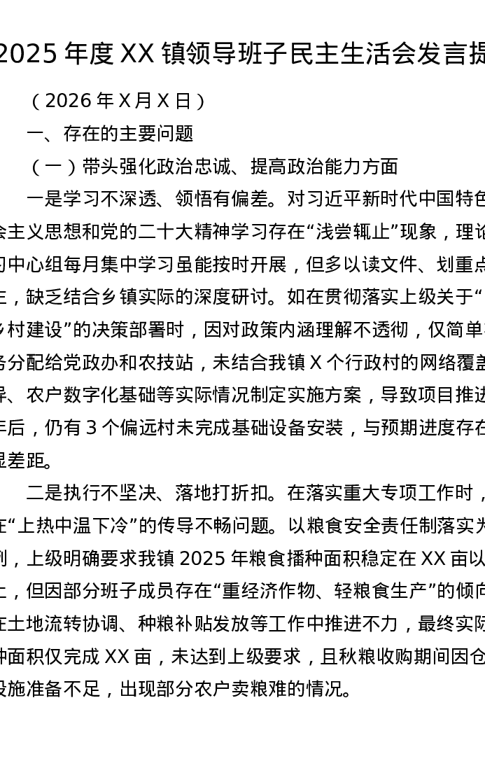 【原创】2025年度XX镇领导班子xxxxx发言提纲1