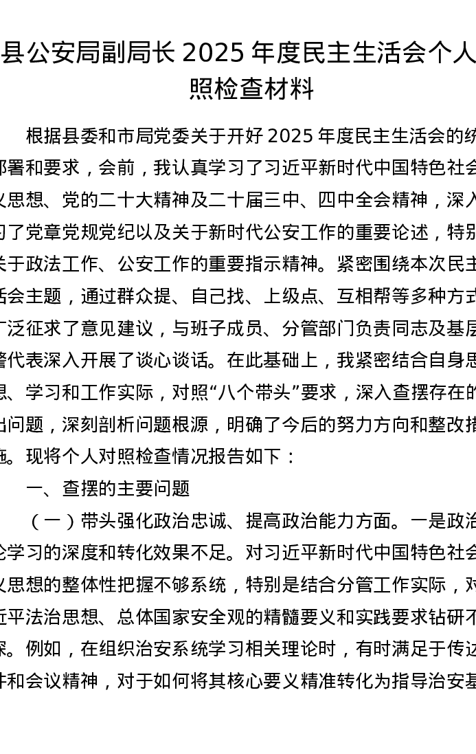 【原创】县公安局副局长2025年度xxxxx个人对照检查材料