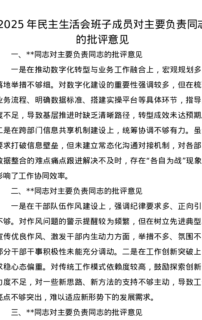 2025年xxxxx班子成员对主要负责同志的批评意见