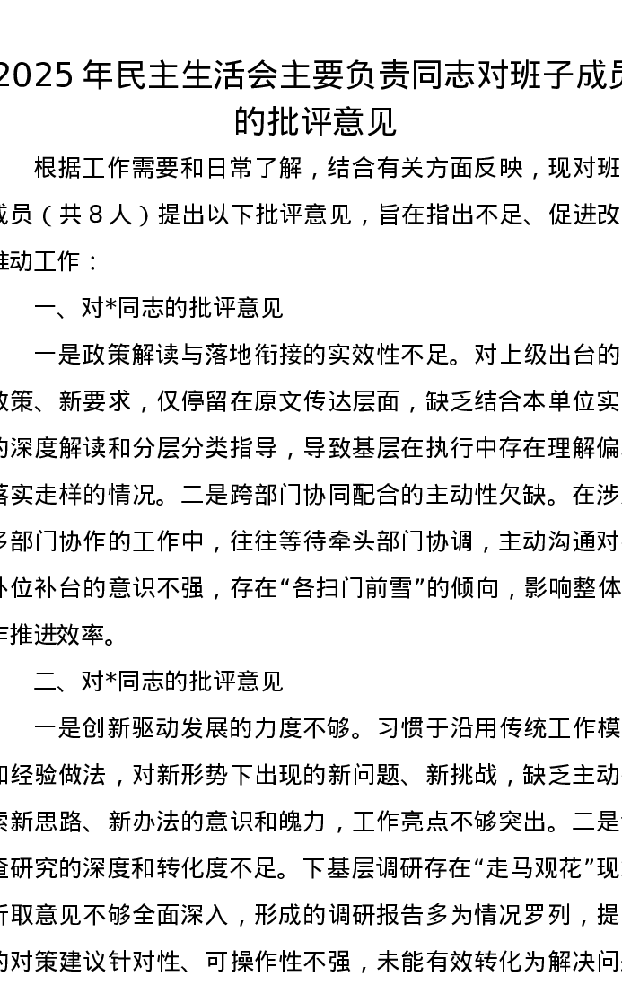 2025年xxxxx主要负责同志对班子成员的批评意见