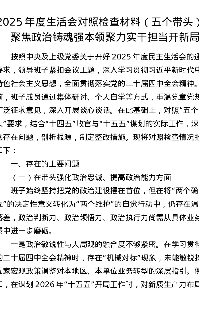 2025年度生活会对照检查材料(五个带头):聚焦政治铸魂强本领 聚力实干担当开新局