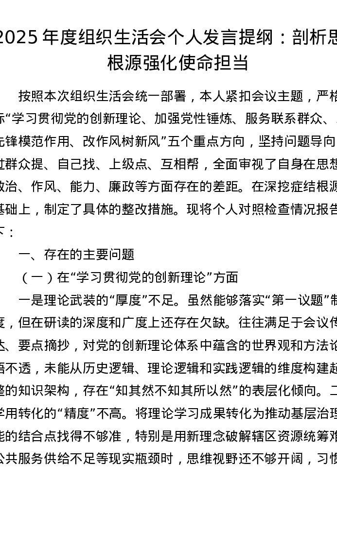 2025年度组织xxx个人发言提纲:剖析思想根源 强化使命担当