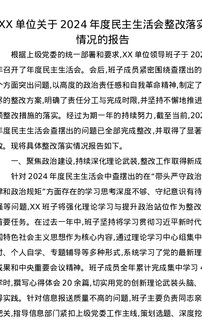 XX单位关于2024年度xxxxx整改落实情况的报告