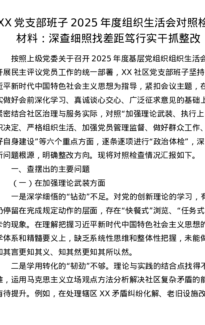 XX党支部班子2025年度组织xxx对照检查材料:深查细照找差距 笃行实干抓整改