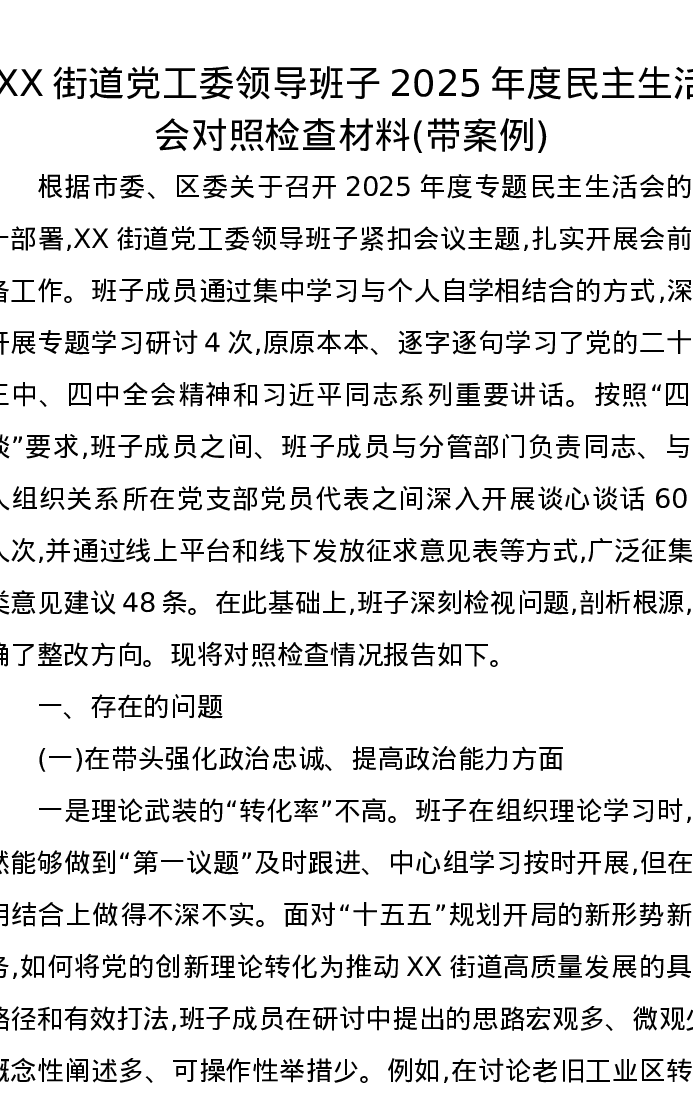 XX街道党工委领导班子2025年度xxxxx对照检查材料(带案例)