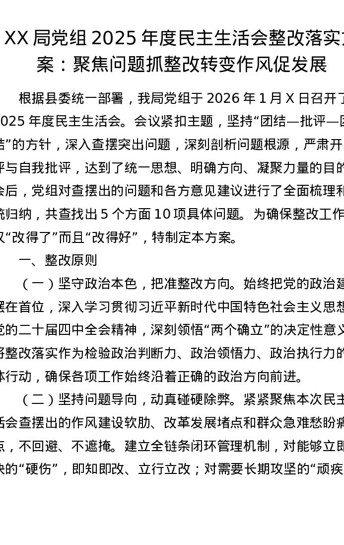 XX局党组2025年度xxxxx整改落实方案:聚焦问题抓整改 转变作风促发展