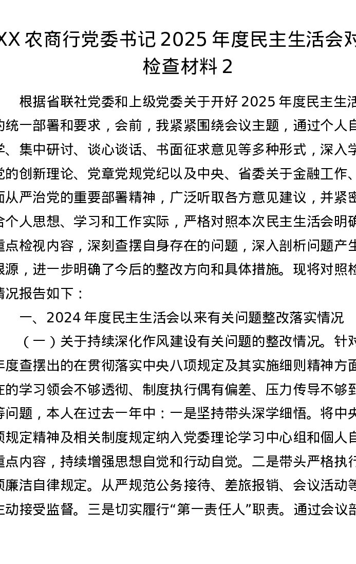 XX农商行党委书记2025年度xxxxx对照检查材料2