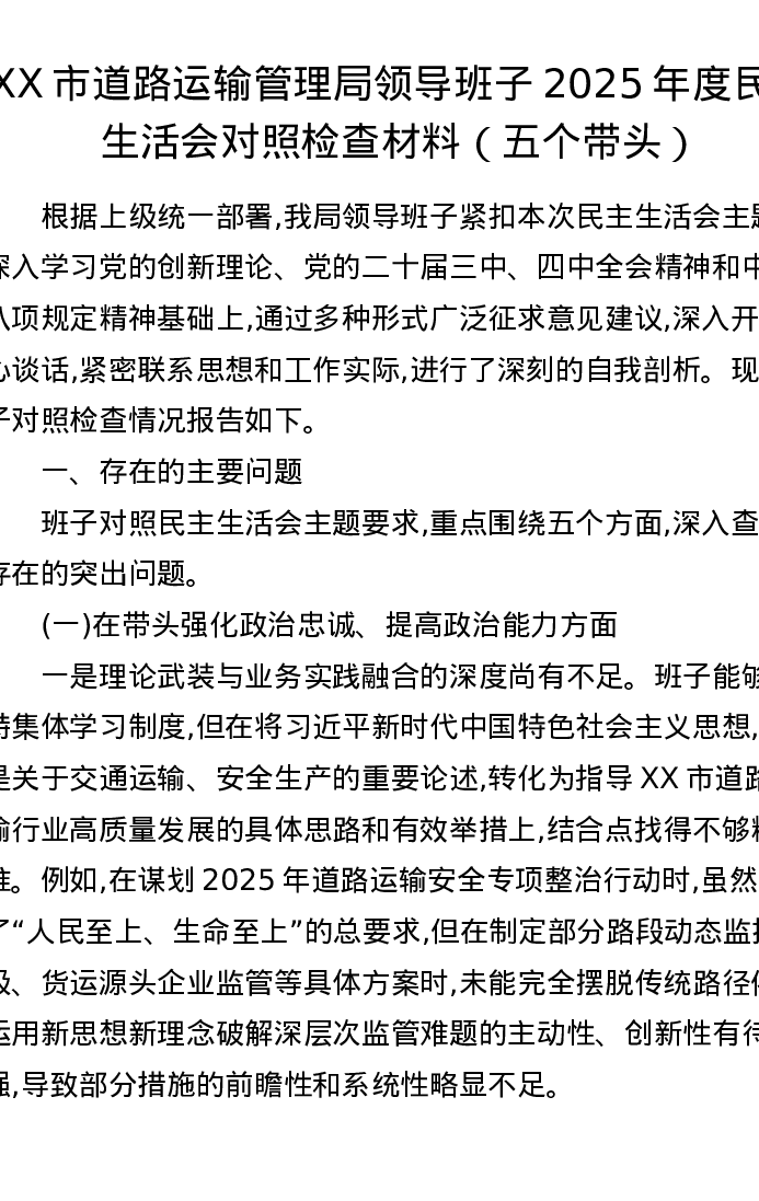 XX市道路运输管理局领导班子2025年度xxxxx对照检查材料(五个带头)