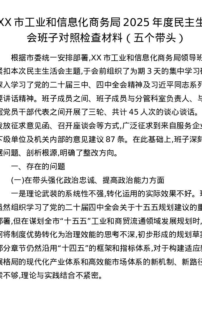 XX市工业和信息化商务局2025年度xxxxx班子对照检查材料(五个带头)