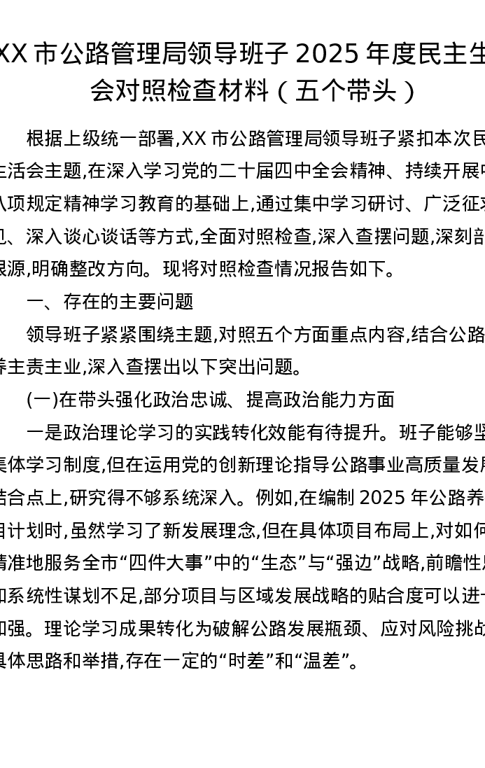 XX市公路管理局领导班子2025年度xxxxx对照检查材料(五个带头)