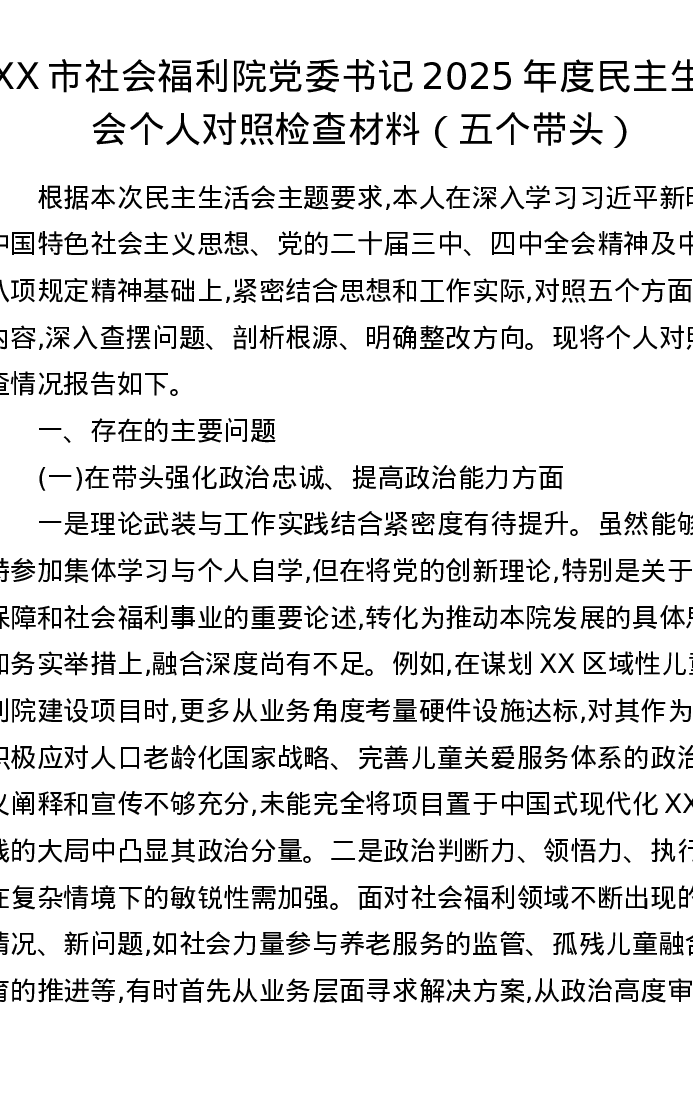 XX市社会福利院党委书记2025年度xxxxx个人对照检查材料(五个带头)