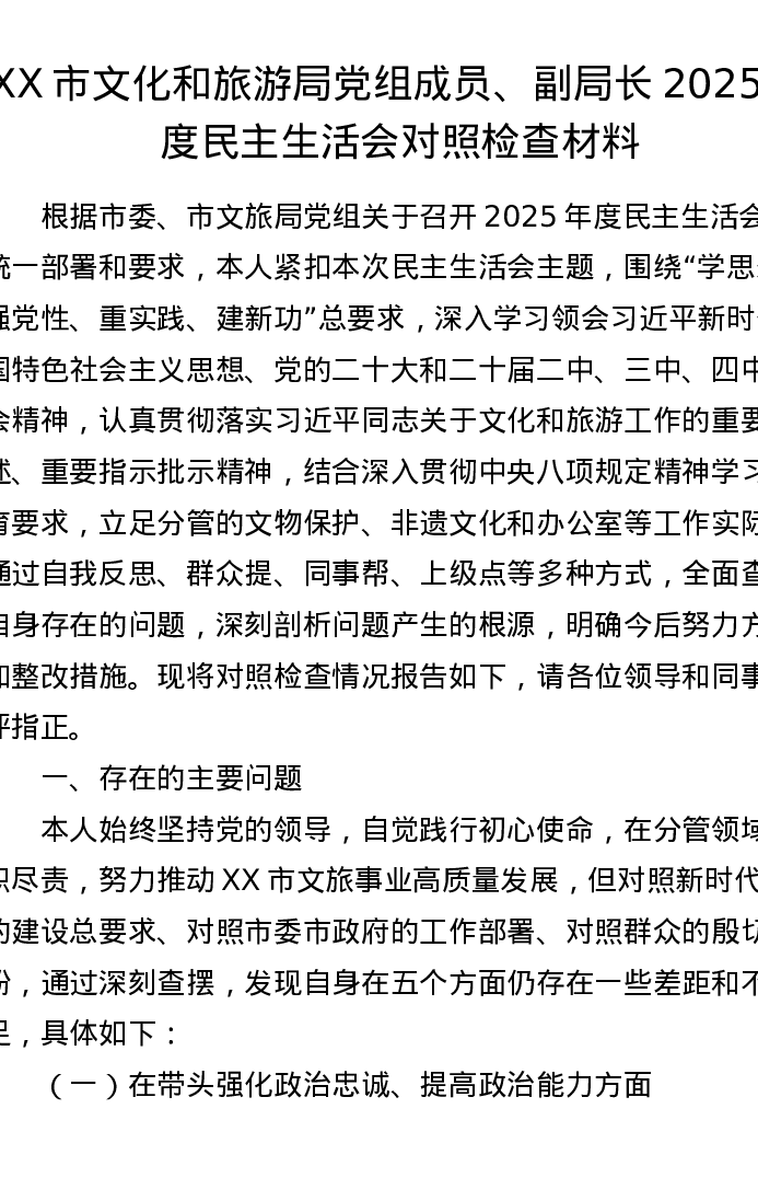 XX市文化和旅游局党组成员、副局长2025年度xxxxx对照检查材料