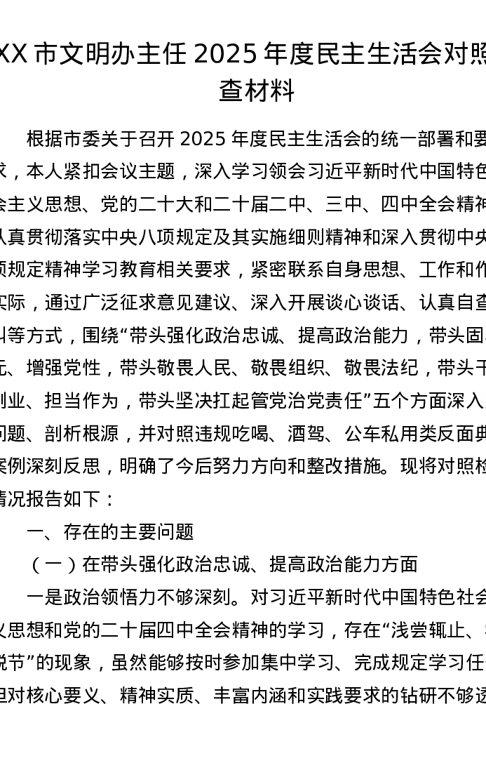 XX市文明办主任2025年度xxxxx对照检查材料