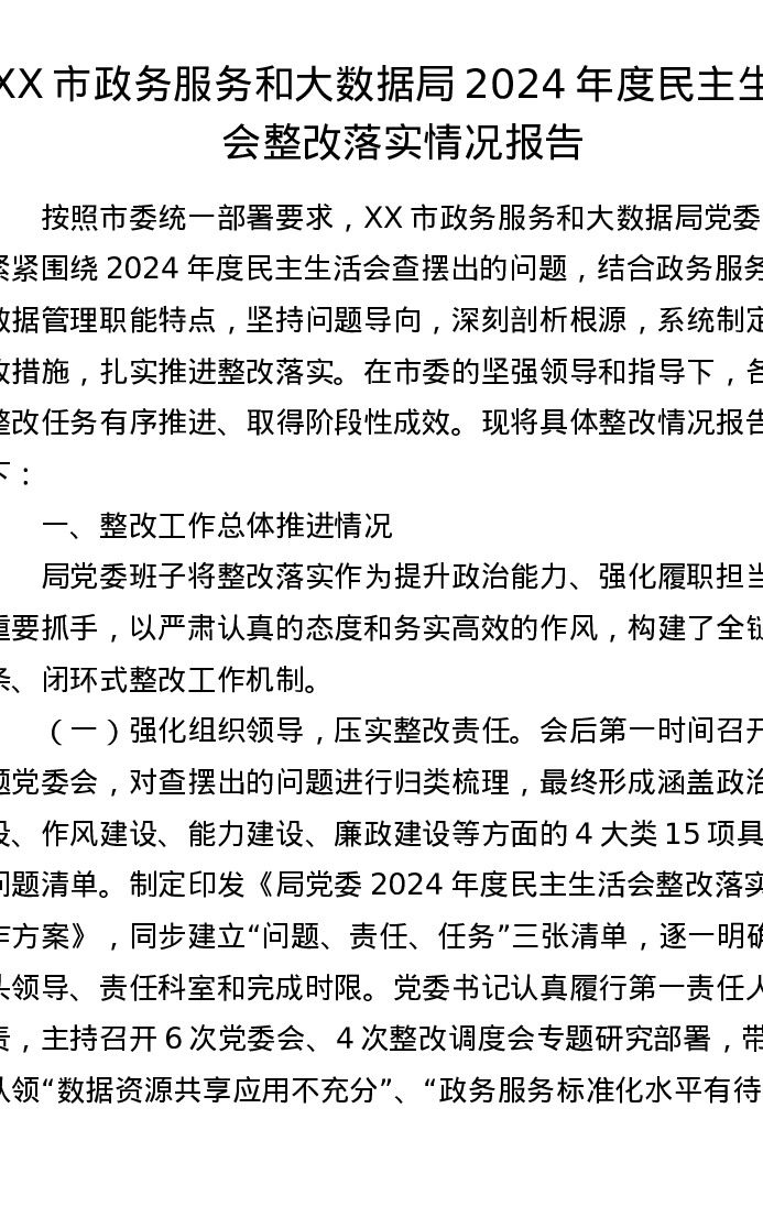 XX市政务服务和大数据局2024年度xxxxx整改落实情况报告