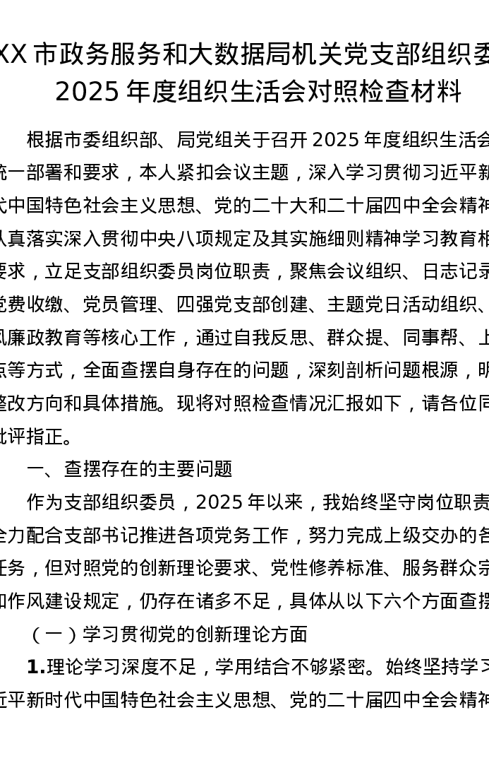 XX市政务服务和大数据局机关党支部组织委员2025年度组织xxx对照检查材料
