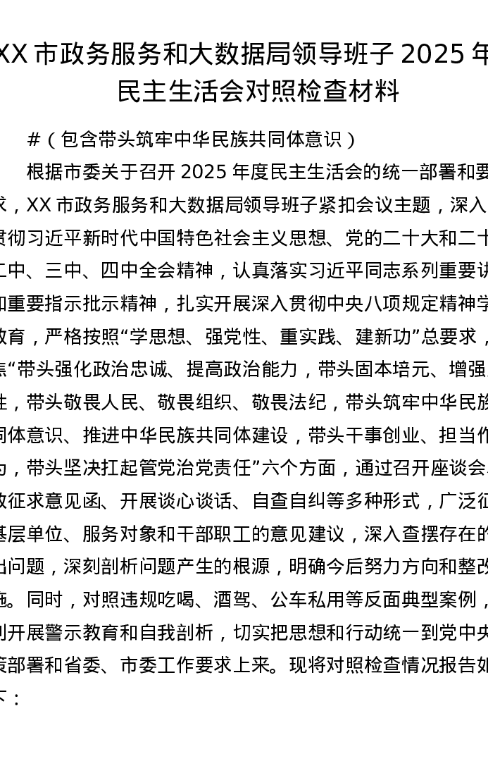 XX市政务服务和大数据局领导班子2025年度xxxxx对照检查材料(包含带头筑牢中华民族共同体意识)