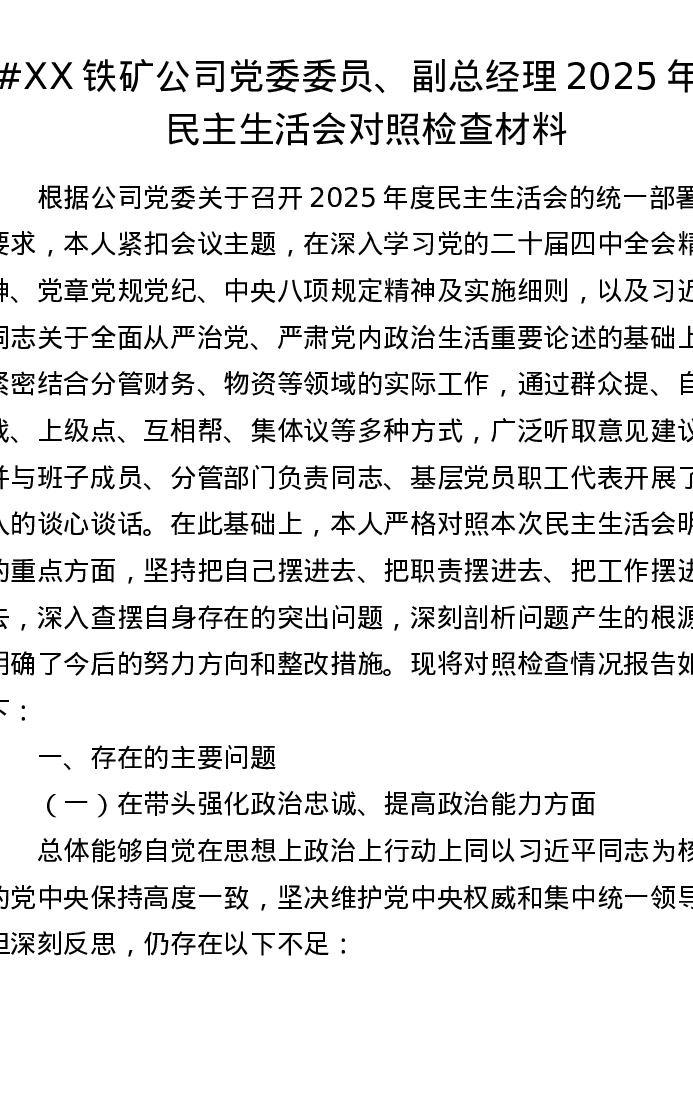 XX铁矿公司党委委员、副总经理2025年度xxxxx对照检查材料