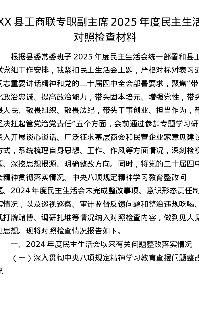 XX县工商联专职副主席2025年度xxxxx对照检查材料