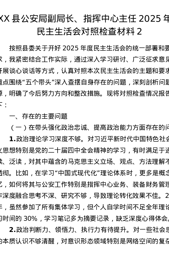 XX县公安局副局长、指挥中心主任2025年度xxxxx对照检查材料2
