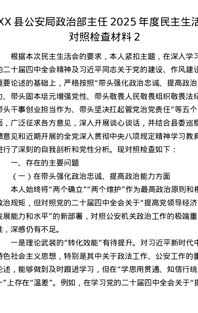 XX县公安局政治部主任2025年度xxxxx对照检查材料2