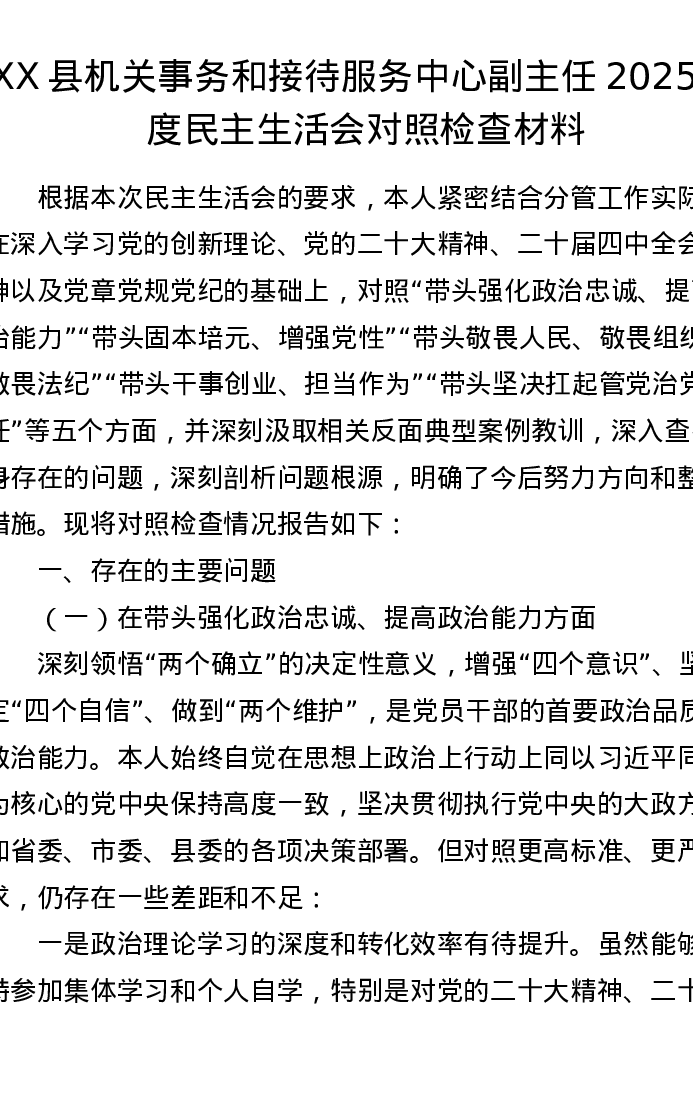 XX县机关事务和接待服务中心副主任2025年度xxxxx对照检查材料