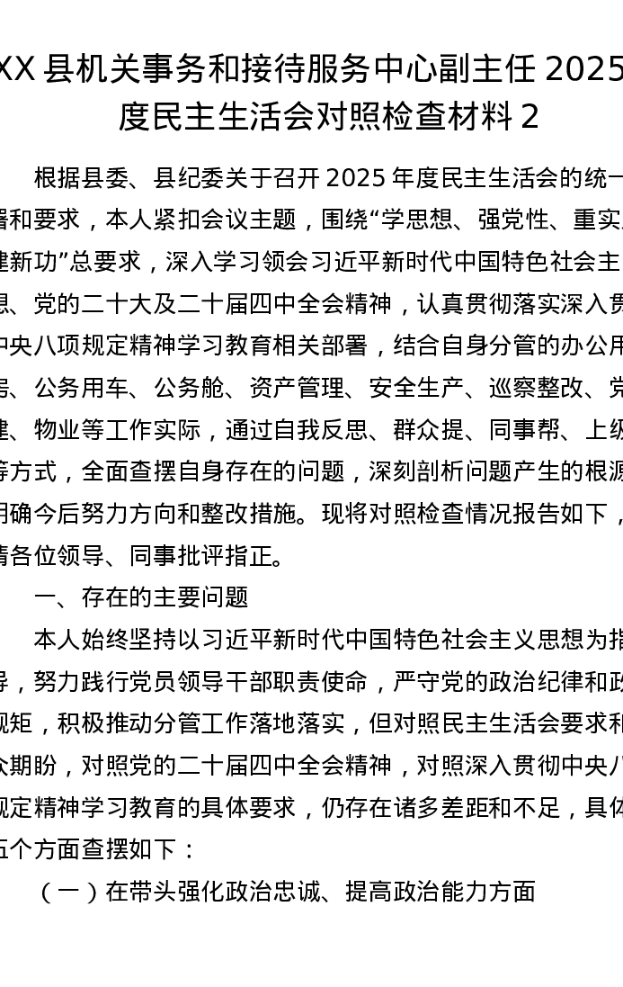 XX县机关事务和接待服务中心副主任2025年度xxxxx对照检查材料2