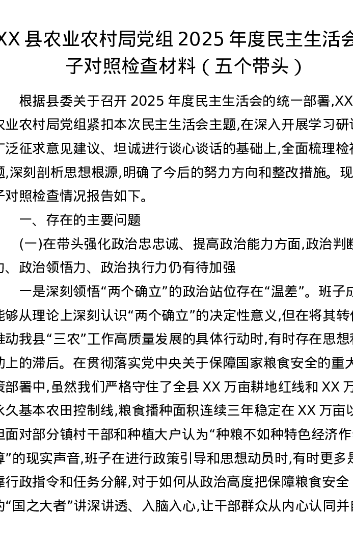 XX县农业农村局党组2025年度xxxxx班子对照检查材料(五个带头)