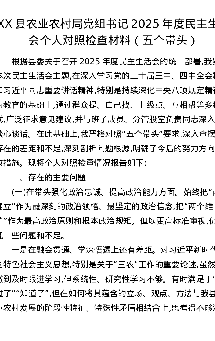 XX县农业农村局党组书记2025年度xxxxx个人对照检查材料(五个带头)