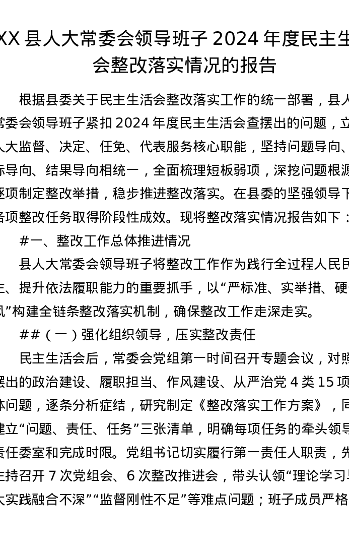 XX县人大常委会领导班子2024年度xxxxx整改落实情况的报告(4448字)