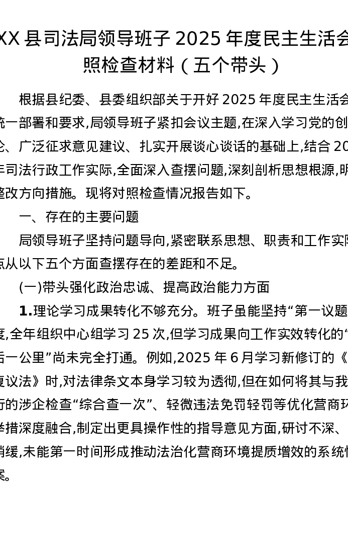 XX县司法局领导班子2025年度xxxxx对照检查材料(五个带头)