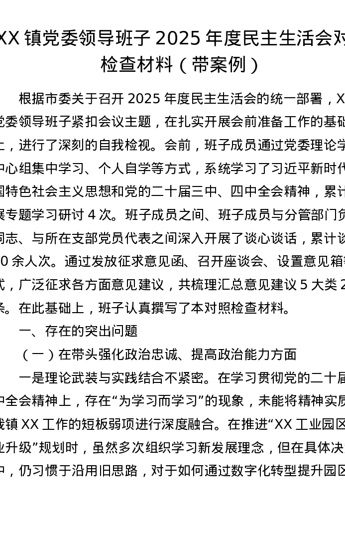 XX镇党委领导班子2025年度xxxxx对照检查材料(带案例)