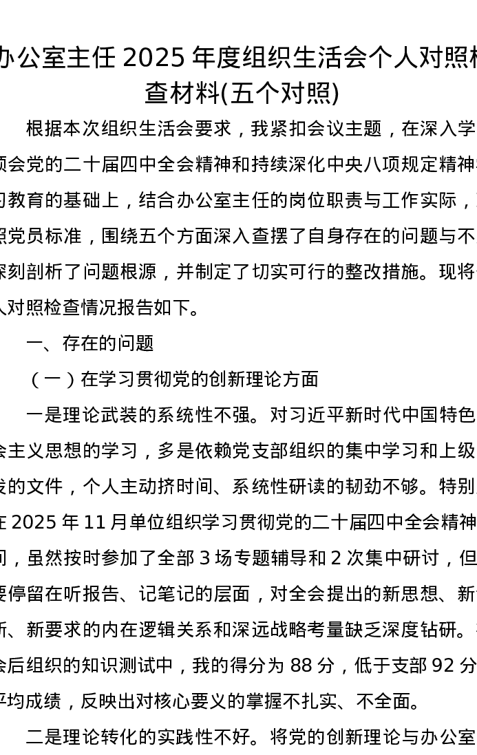 办公室主任2025年度组织xxx个人对照检查材料(五个对照)