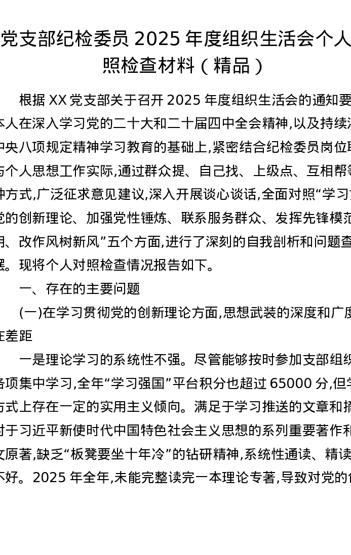 党支部纪检委员2025年度组织xxx个人对照检查材料
