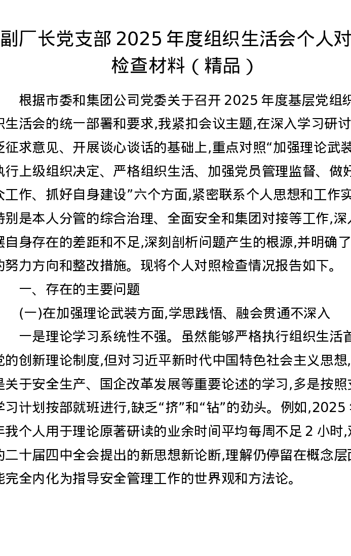 副厂长党支部2025年度组织xxx个人对照检查材料