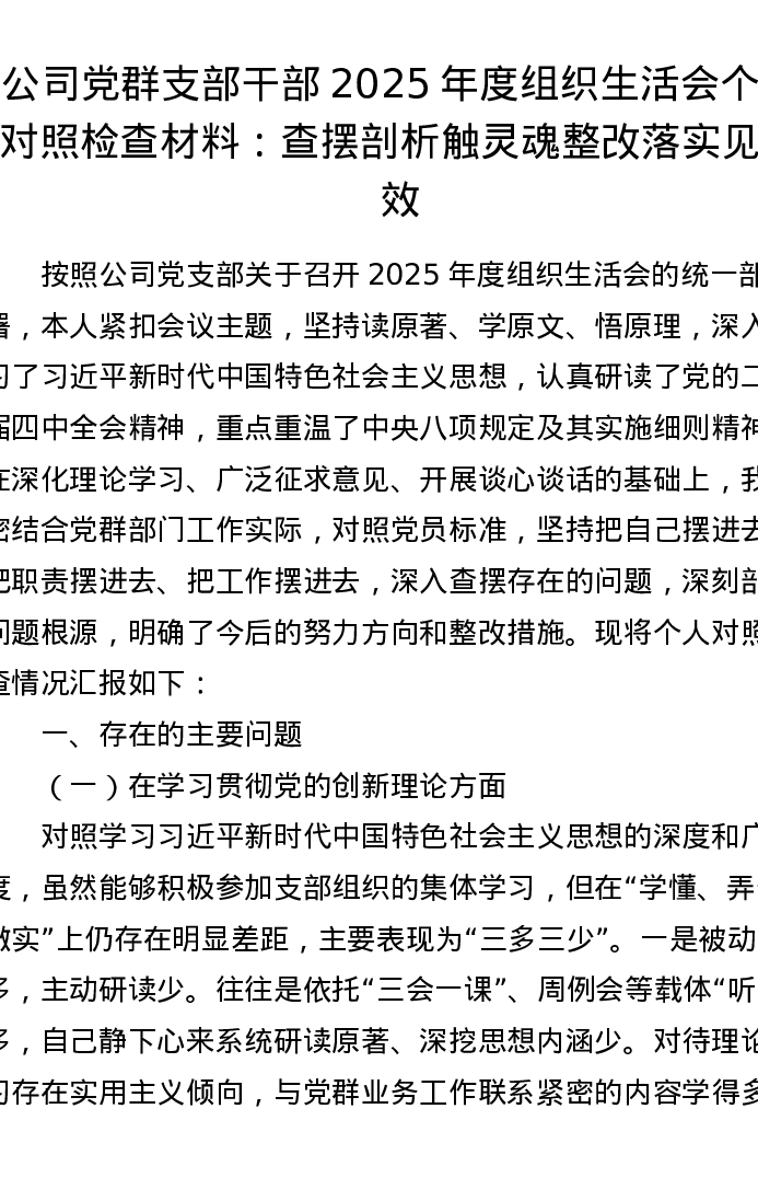 公司党群支部干部2025年度组织xxx个人对照检查材料:查摆剖析触灵魂 整改落实见实效