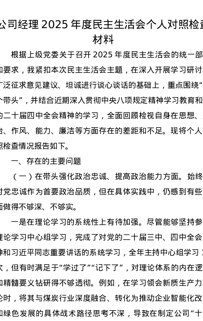 公司经理2025年度xxxxx个人对照检查材料