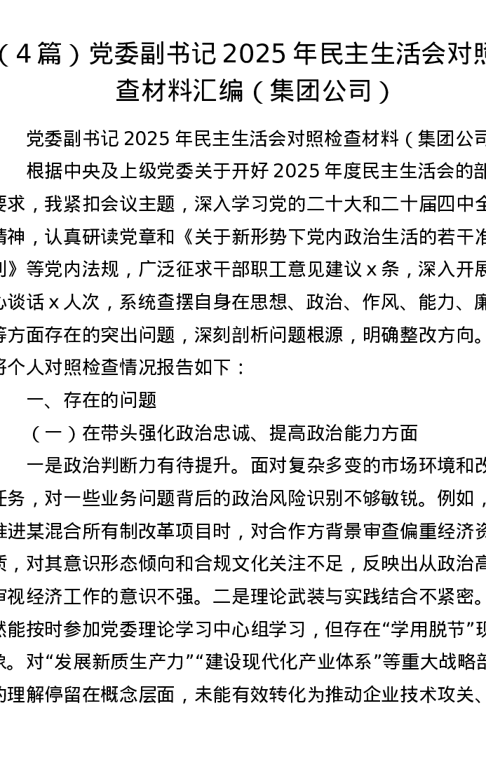 汇编:党委副书记2025年xxxxx对照检查材料4篇(集团公司)