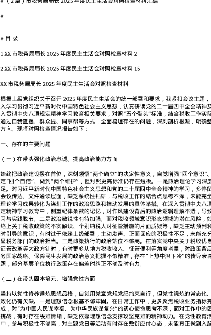 汇编:市税务局局长2025年度xxxxx对照检查材料2篇